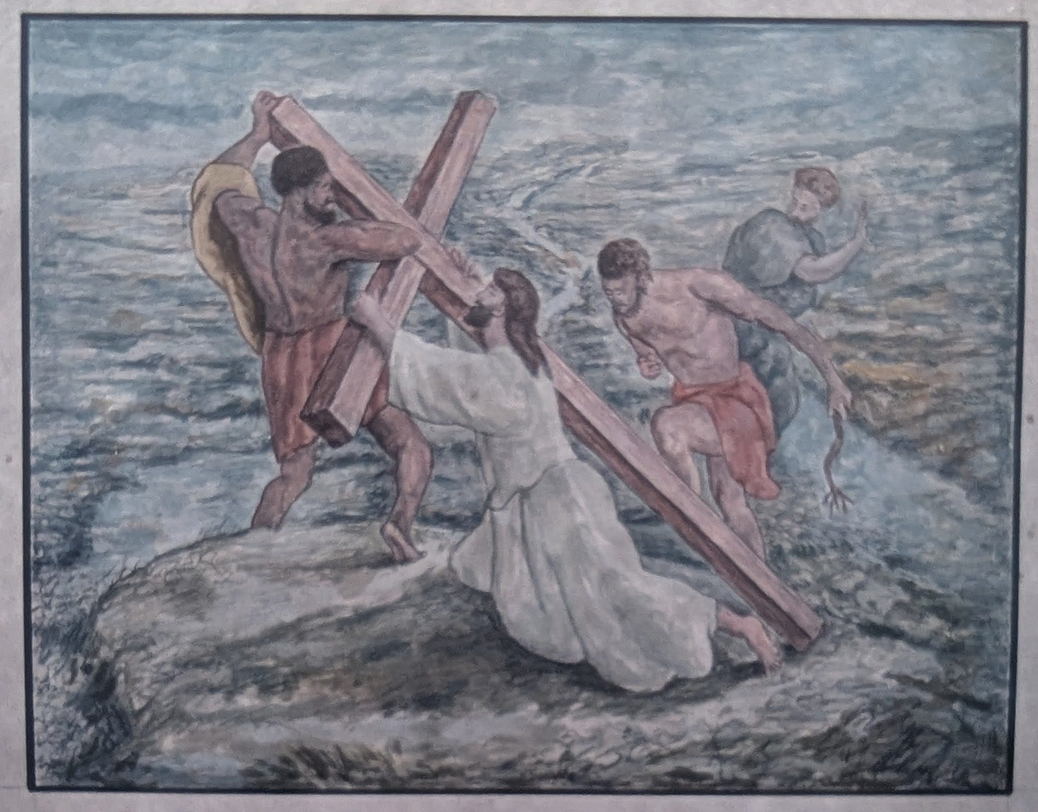 2 & 3. Simon Helps with the Cross — graphite on paper and watercolor on canvas.