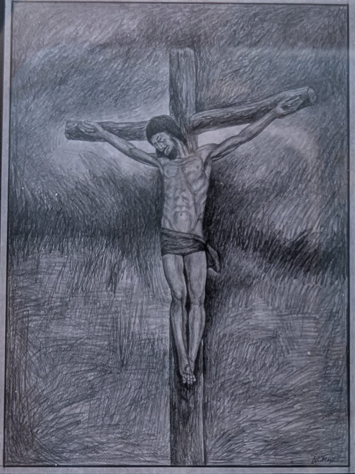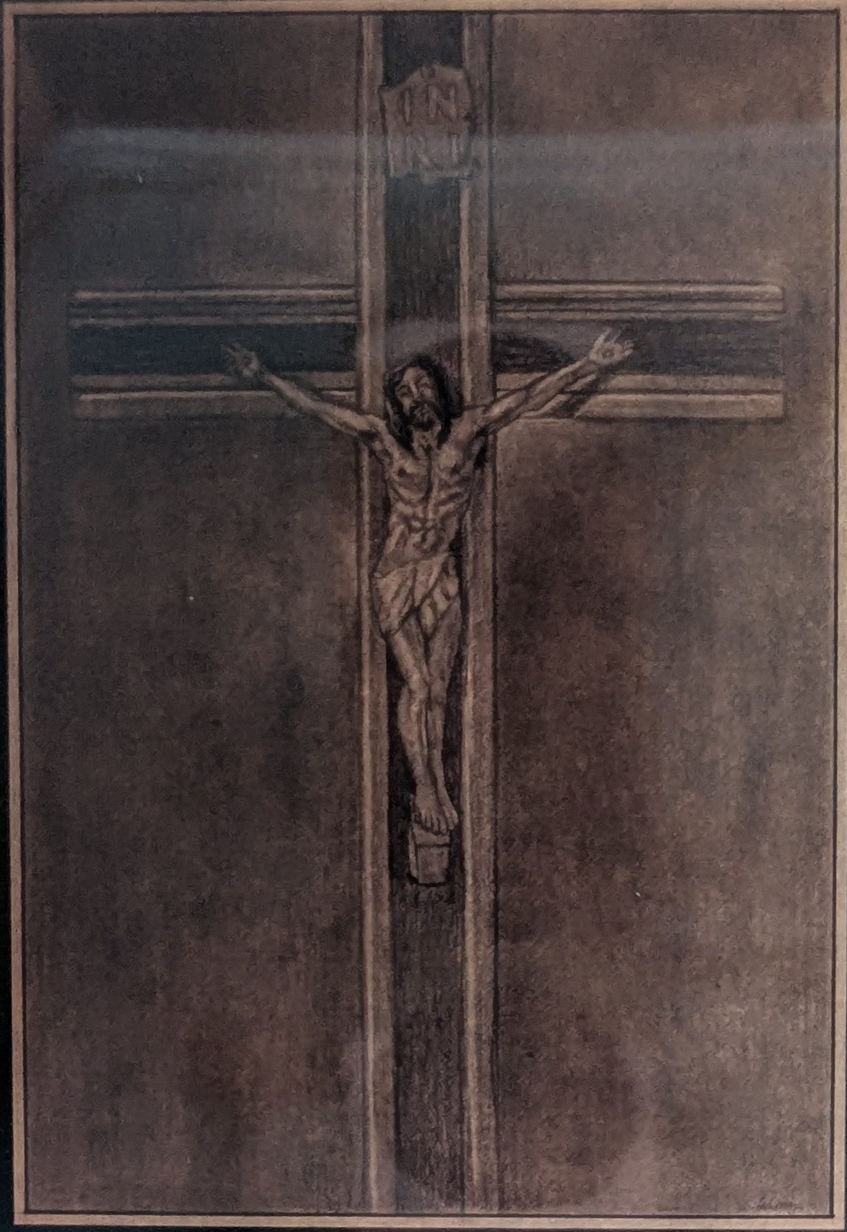 In this drawing at Jesus’ feet, a slanted wooden block seems to support him. A small shift in posture that changes everything. Even though I recognize this drawing to be one of my father’s crucifix about the size of his hand he kept around his studio, the depiction of Jesus here seems very lifelike and realistic compared to the inanimate object I assume inspired this drawing.