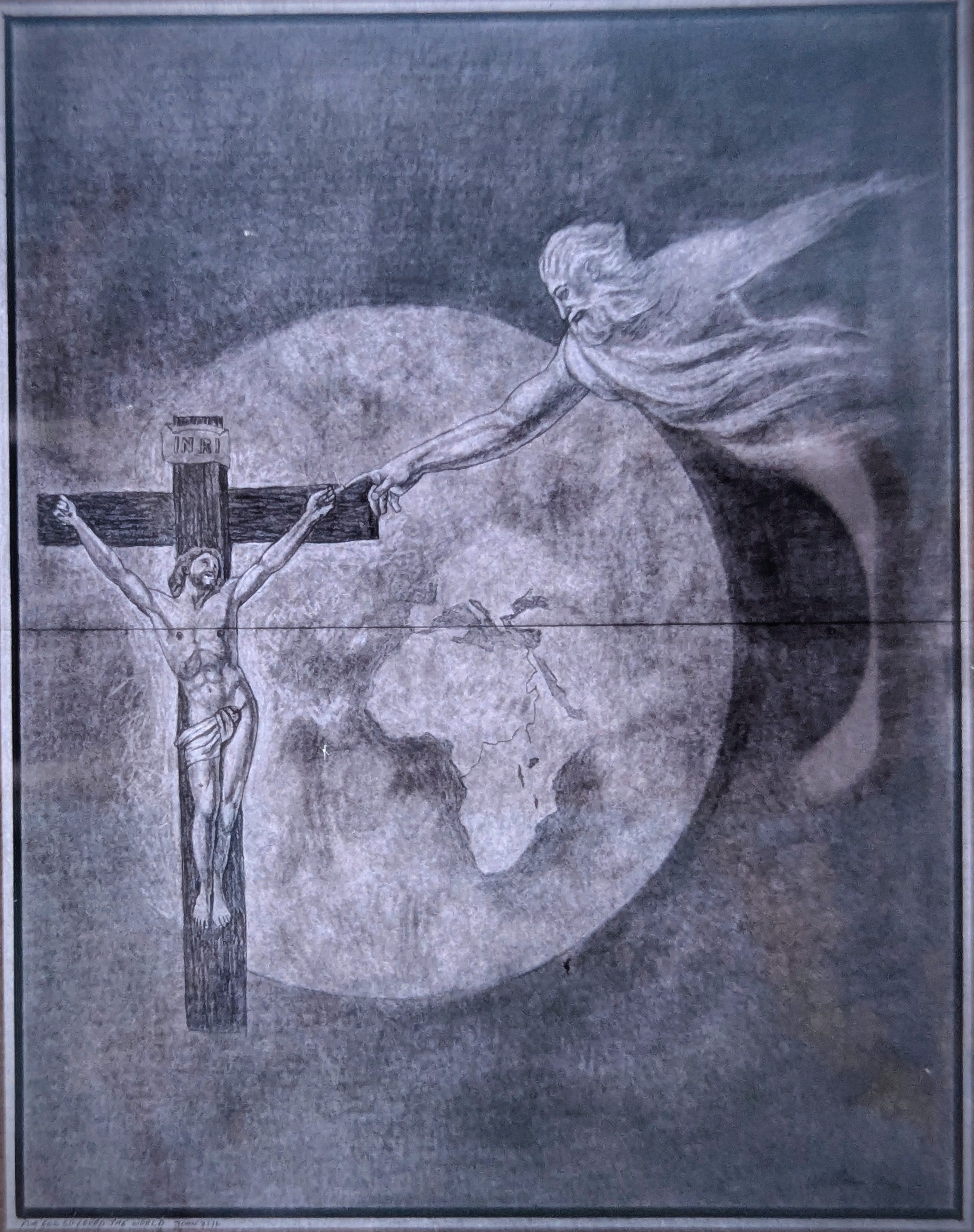 A drawing suspended in space. Jesus, crucified with arms nailed upward. From the right, a fatherly spirit reaches out in the same gesture as God in Michelangelo’s Creation of Adam. The same profile, same flowing hair. Between them, the planet Earth shows Africa most clearly.